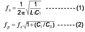 在評(píng)估共振時(shí)的等效線路時(shí), 串聯(lián)諧振頻率及并聯(lián)諧振頻率, fr and fa ,是最重要的二個(gè)頻率參數(shù). 對(duì)于串聯(lián)諧振頻率及并聯(lián)諧振頻率( fs and fp )二者的關(guān)系, 我們可以用下列公式來(lái)表達(dá):
