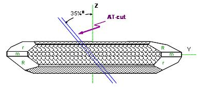 在各種不同種類的切割角度方式中, AT角度切割的石英芯片適用在數MHz到數佰MHz的頻率范圍,是石英芯片應用范圍最廣范及使用數量最多的一種切割應用方式. 在(圖五)中, 從石英晶棒X-軸向的上視圖, 可以看到對Z-軸向旋轉約35度的AT 方向. 這在大量生產的技術上也是很好達成的一種作業方式.