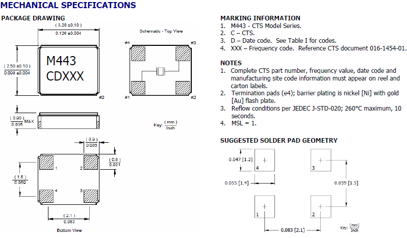 CTS晶振,貼片晶振,443晶振,石英晶體諧振器,低頻晶振可從12MHz起對應,小型,超薄型具備強防焊裂性,石英晶體在極端嚴酷的環境條件下也能發揮穩定的起振特性,產品本身具有耐熱,耐振,耐撞擊等優良的耐環境特性,滿足無鉛焊接以及高溫回流溫度曲線要求