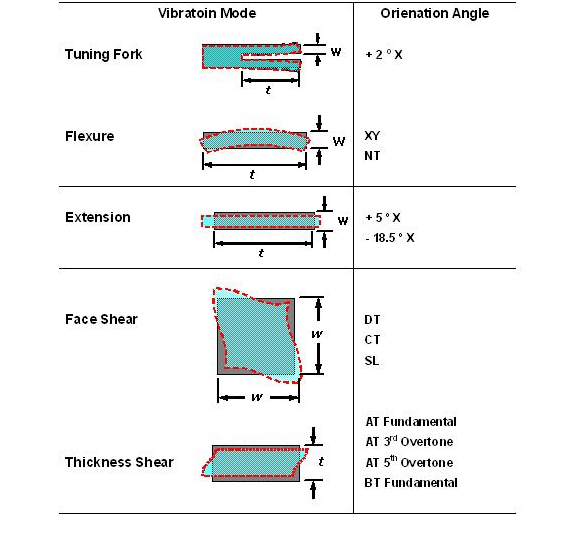經(jīng)由不同的石英切割角度及不同電極型狀的電場(chǎng)效應(yīng), 石英芯片展現(xiàn)了各種不同的振動(dòng)模態(tài). 以經(jīng)常產(chǎn)生的振動(dòng)模態(tài)可以概分為擾曲模態(tài)(flexure mode), 伸縮模態(tài)(extension mode), 面剪切模態(tài)(face shear mode) 和 厚度剪切模態(tài)(thickness shear mode). 這幾種振動(dòng)模態(tài)以簡(jiǎn)單的方法在表一中可以看到. 在實(shí)際狀況中, 石英芯片并不是一定祇有單一種振動(dòng)模態(tài), 而可能有多種模態(tài)同時(shí)存在在一個(gè)石英芯片的振蕩中, 經(jīng)由適當(dāng)?shù)脑O(shè)計(jì), 可以壓制其它不希望產(chǎn)生的振動(dòng)模態(tài)(unwanted mode), 來達(dá)到主要振動(dòng)模態(tài)的最佳化.境保護(hù)方針.jpg)