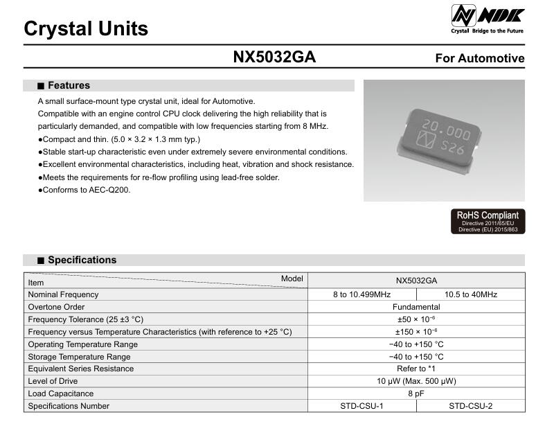 | NX5032GA-10.000M-STD-CSU-1 | NDK | CRYSTAL 10.0000MHZ 8PF SMD | ±50ppm | -40°C ~ 150°C | 2 | 5032 |