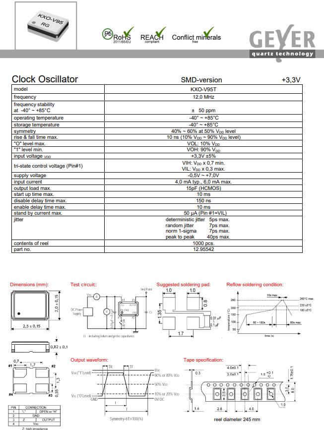| 12.95542 | GEYER | XTAL OSC XO 12.0000MHZ SMD | KXO-V95T | 12 MHz | - | ±50ppm | -40°C ~ 85°C | 4 | 2520 |