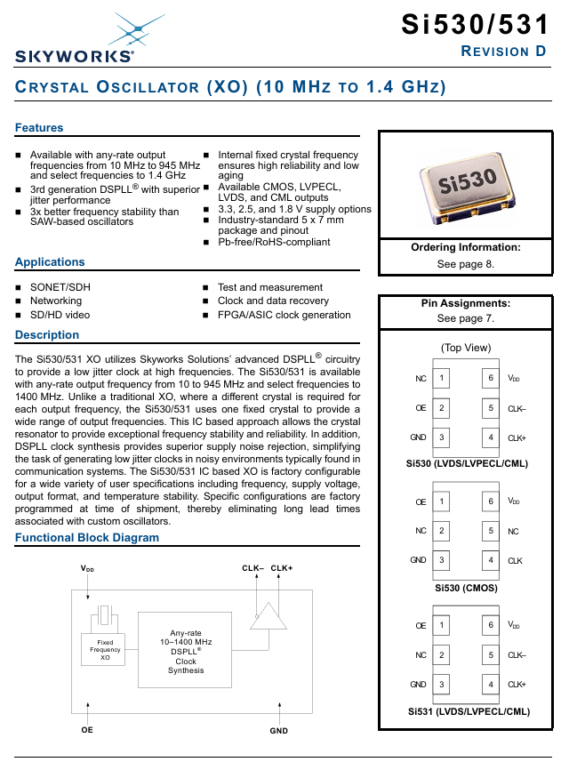 更多>>Skyworks思佳訊晶振530CC64M0000DG 7050 XO 64M六腳晶振
