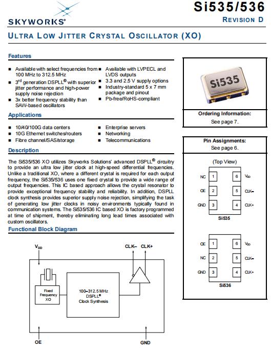 編碼536BB156M250DG,頻率為156.25MHz,Si535/536 XO時鐘振蕩器,OSC石英晶體振蕩器,采用Skyworks Solutions先進的DSPLL®電路在高速差分頻率下提供超低抖動時鐘。不像傳統的XO,每個輸出都需要不同的晶體頻率,Si535/536使用一個固定晶體提供廣泛的輸出頻率。這種基于集成電路的方法允許晶體諧振器提供卓越的頻率穩定性和可靠性。此外,DSPLL時鐘合成提供了優越的電源噪聲抑制,簡化了任務在嘈雜的環境中產生低抖動時鐘的方法通信系統。基于Si535/536 IC的XO是工廠編程的在發貨時,從而消除了較長的交貨時間定制的振蕩器。