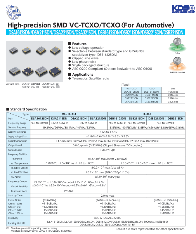 這款VC-TCXO有源晶振的核心優勢,在于其對極端環境的超強適應力.作為符合AEC-Q200標準的車規產品,它能在-40℃至+85℃的寬溫區間內穩定運行,頻率偏差控制在±1.0×10??以內.這種嚴苛環境下的穩定性,恰是車載系統的生命線——進口晶振無論是遠程信息處理傳輸數據,還是衛星廣播接收信號,微小的頻率偏差都可能導致通信中斷.而其低相位噪聲特性,更讓信號傳輸如“靜水行舟”,在10kΩ//10pF的負載條件下,相位噪聲指標可達-155dBc/Hz,為車載通信筑起抗干擾的“防護盾”.KDS溫補晶振,大真空有源晶振石英晶振
