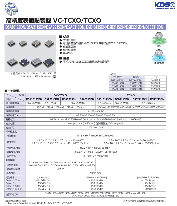 更多>>7EG02600A0S日本KDS小尺寸溫補晶振DSB1612SDN 26M TCXO