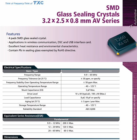 更多>>AV20000003黑色3225 20M 8PF車規TXC晶振