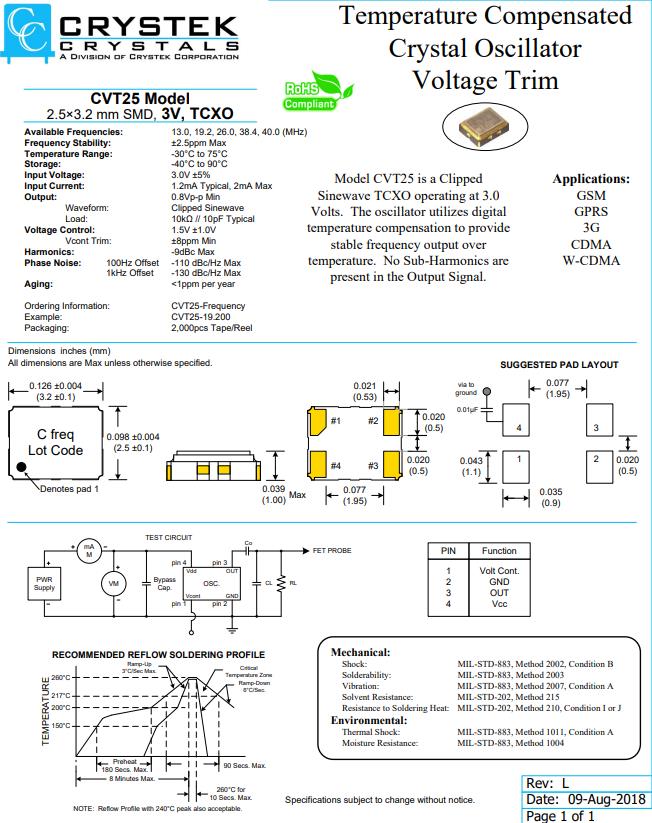 | CVT25-38.400 | CRYSTEK振蕩器 | CVT25 | TCXO | 38.4MHz | ±2.5ppm | -30°C ~ 75°C |