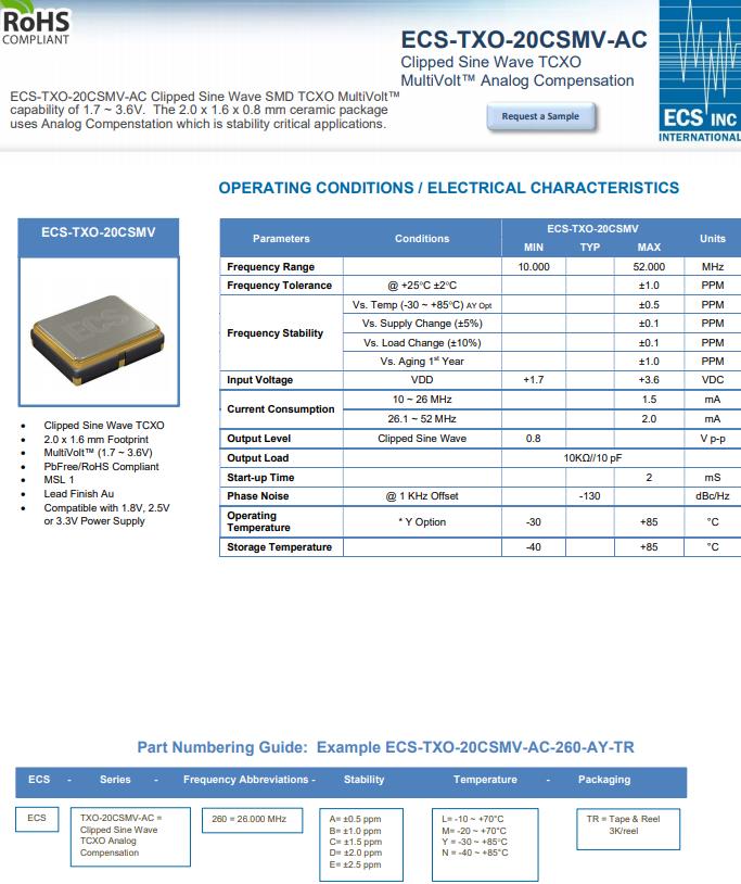 ECS晶振推出的溫度補(bǔ)償晶體振蕩器在1.7V至3.6V的多電壓能力和 1.8V、2.5V、3.0V 的靜態(tài)電源下,在-30°C至+85°C提供±0.5 ppm的超嚴(yán)密穩(wěn)定性選項(xiàng),和3.3V。ECS-TXO-20CSMV-AC使用高刷新率或頻率校準(zhǔn)率,在溫度補(bǔ)償期間保持線性頻率輸出。2.0 x 1.6 x 0.8 mm封裝使其適用于無線、Wi-Fi和物聯(lián)網(wǎng)應(yīng)用。削波正弦波溫補(bǔ)晶振為精密應(yīng)用提供超緊密的穩(wěn)定性ECS-TXO-20CSMV-AC-260-AY-TR