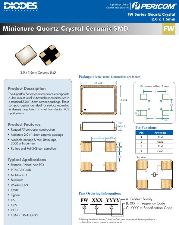 FW374WFMR1緊湊型石英晶體是手持電腦最佳甄選,Diodes作為臺灣知名晶振品牌公司,一直以來專注于研發生產各種各樣高質量的產品,同時為高質量應用特定標準產品全球制造商與供貨商,產品涵蓋廣泛領域,包括獨立、邏輯、模擬及混合訊號半導體市場。Diodes服務的市場包括消費性電子、計算機、通訊、工業及汽車市場。百利通亞陶公司利用自身對于市場的了解開發眾多高質量的石英晶體產品,也確保所生產的產品能夠滿足用戶不同的需求.
