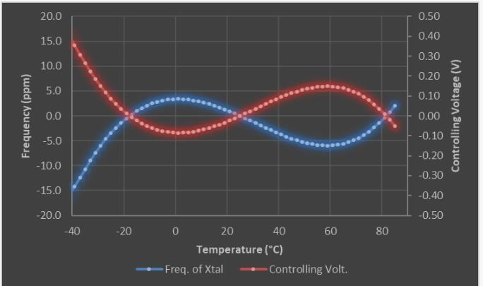 溫補晶振溫度(ΔT)將轉換為成比例的溫度電壓(V_T).下一步,使用多項式函數發生器將溫度電壓(V_T)轉換為特定的控制電壓(V_C.