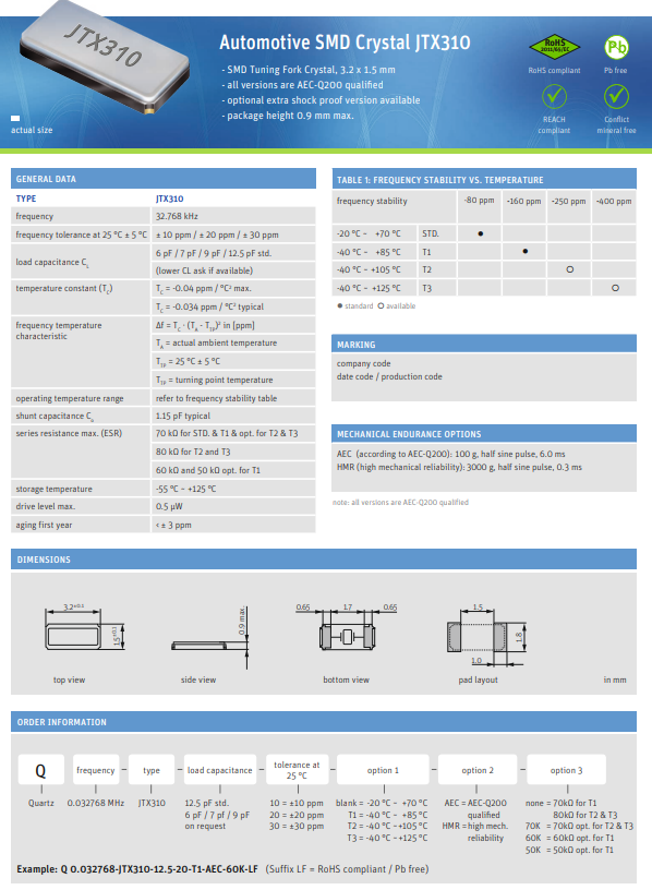 | Q 0.032768-JTX310-12.5-20-T3-HMR-70K-LF | Jauch Quartz | JTX310 | 32.768kHz | ±20ppm | 12.5pF | -40°C ~ 125°C | 2 | (3.20mm x 1.50mm) | 0.035" (0.90mm) |