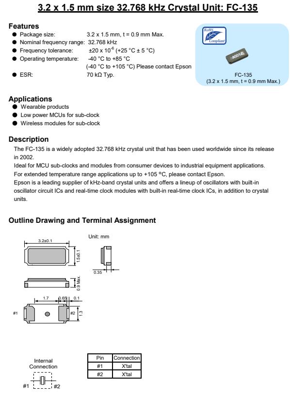 X1A0001410001 3.2 x 1.5 x 0.9 mm FC-135R 32.768kHz 7 pF +/-20.0 ppm -40 to +85 °C