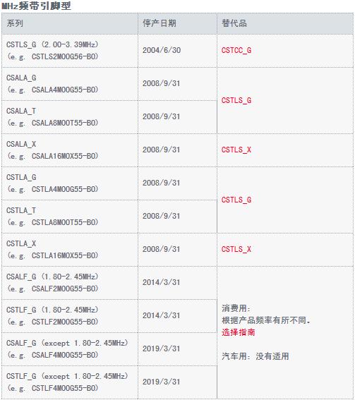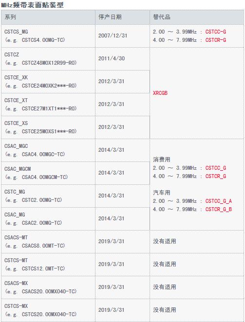 這次一共有三種類型的村田晶振被判出局,分別是MHZ頻帶表面貼裝型、MHZ頻帶引腳型、KHZ頻帶引腳型。接下來,壹兆電子會將Murata晶振停產(chǎn)的產(chǎn)品型號、日期和可代替產(chǎn)品料號完整的提供,請廣大新老客戶按照型號或系列對照,若有自己常用的型號請及時(shí)與我司壹兆電子業(yè)務(wù)人員聯(lián)系!